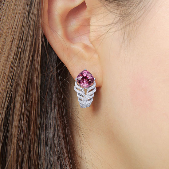 18k金镶嵌缅甸天然紫红色尖晶石,配石为天然钻石,主石重量为6.5ct,整体尺寸约为:22*12mm。