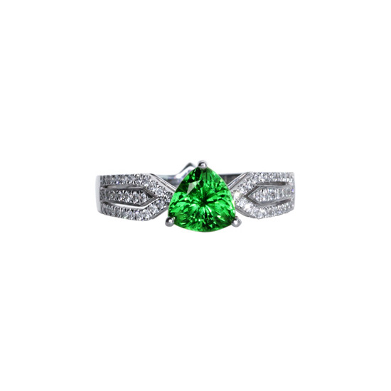 18k金镶嵌天然沙弗莱,主石重量为1.37ct,全净体,配石为0.226ct天然钻石,手寸13号。